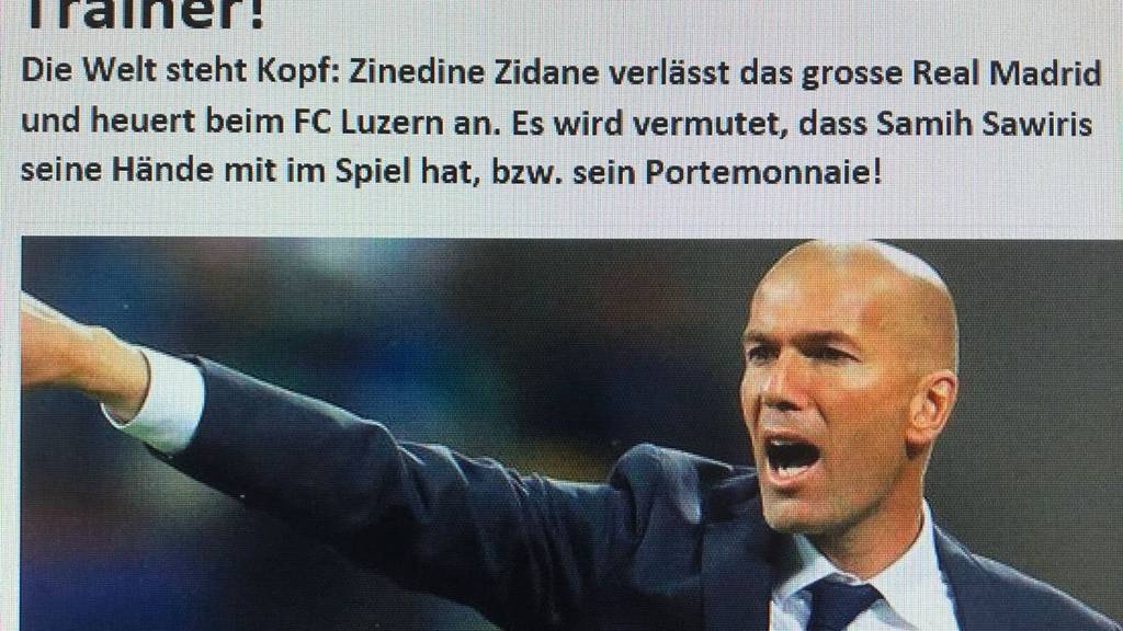 Die Meldung ist zu spektakulär, um wahr zu sein. Zinédine Zidane, der mit Real Madrid drei Mal in Folge die Champions League gewann, soll Trainer beim FC Luzern werden. Auch wenn die Meldung ein kompletter Fake ist, so bringt sie doch manchen Fussball-Fan zum Schmunzeln. «Es wird vermutet, dass Samih Sawiris seine Hände mit im Spiel hat, bzw. sein Portemonnaie!», heisst es in der Meldung.