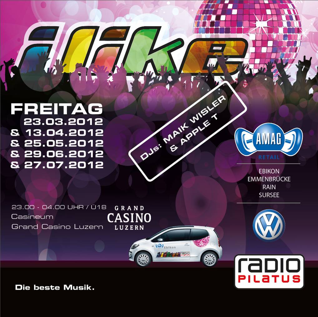 Die nächsten Parties der iLike- und der Ü30 Popkeller-Serie sowie die Primavera-Party 2012 werden besonders speziell. Die AMAG Retail Ebikon, Emmenbrücke, Rain und Sursee übernehmen in diesem Jahr mit dem neuen VW up! Das Hauptsponsoring der Radio Pilatus-Parties. Am Lancierungsevent am 24. Februar werden an der iLike im Casineum Grand Casino Luzern erneut die Matchless Dancers auftreten. Ausserdem gibt Gast-DJ Patrick Nuo sein Set zum Besten. Der internationale Pop-Star wird während rund einer Stunde seine Lieblings-Hits auflegen. Die Resident-DJ’s der iLike, Maik Wisler und Apple-T, werden das Programm abrunden und wie immer das Casineum rocken. Auch an der Ü30 Popkeller-Party wird nebst den Club Gangsters ein Special-Guest-DJ präsent sein.
